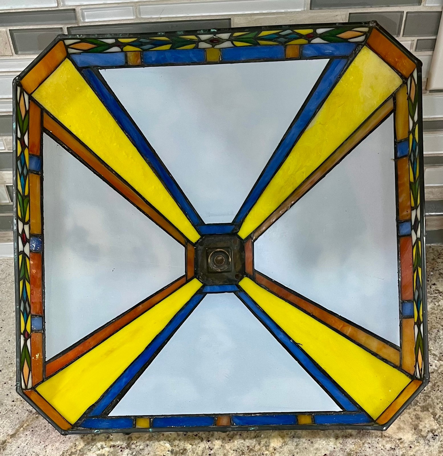You will receive this pictured rare vintage stained glass lamp shade from The Danbury Mint. This beautiful retro Tiffany-style multicolored stained glass lamp shade measures approximately 14" X 14" and the diagonal measurement is approximately 17 3/4 inches.
